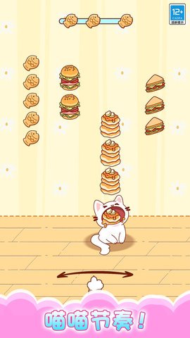 1、玩家需要通过滑动控制小猫的移动,让它准确地接住天上掉下的美食,而这些美食的掉落正好与音乐的节奏相匹配。