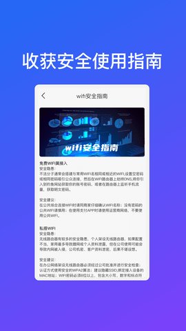 3、它提供了一键获取附近WiFi网络、智能化连接使用、安全检测和安全指南等多项服务,满足了用户的连接需求和网络安全需求。