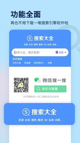 1、搜索大全是一款集合了国内外主流搜索引擎的综合搜索工具应用。