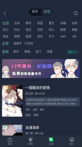 2、耽漫之家涵盖了各类耽美题材的漫画,包括青春、HE、BE、架空、动漫、快穿、古代、现代、校园、甜文、虐文等。