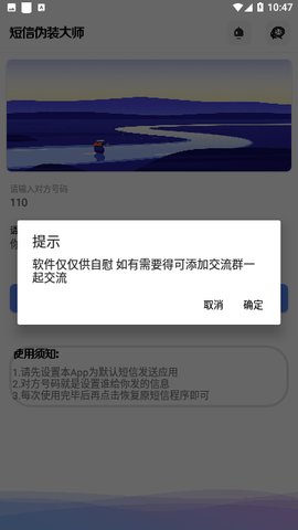 2、短信伪装大师免费版还是一款模拟短信软件,它可以编辑一个发给自己的短信内容,让用户可以假装给自己发一条短信信息,增加了一些趣味性。