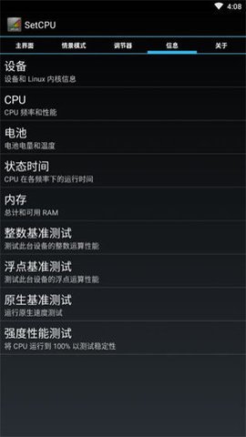 3、SetCPU中文版App是一款功能强大的手机超频软件,用户可以通过这款软件来调节自己手机CPU的运行频率,从而有效地控制手机的电量消耗,并提升游戏或者程序的体验感。