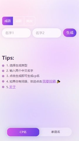 1、通过输入双方的名字和选择词语或成语,用户可以在几秒钟内生成自己喜欢的CP名字。