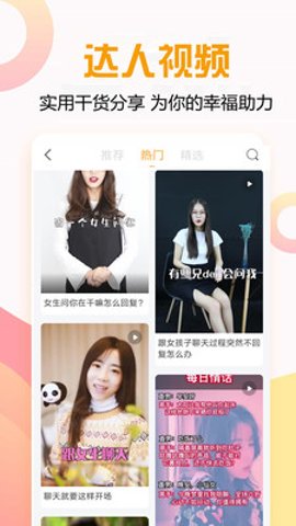3、除了提供丰富的聊天话术和恋爱经验分享,聊天回答神器还提供了恋爱达人干货视频,让你学会聊天,助你快速提高聊天技巧,提高你的情商。
