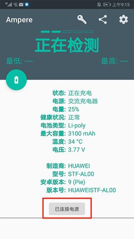 3、用户可以接通电源,观察当前的电源类型、充电功率、电量以及电池的最低和最高容量等参数。