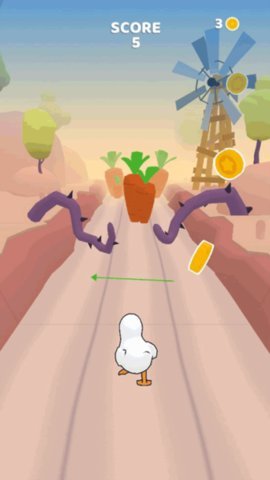 1、玩家需要操作鸭子在道路上跑酷,道路分为3条,玩家需要避开前方拥有陷阱的道路,确保鸭子能够安全通过。