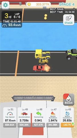 2、在赛道中,你的赛车会根据性能进行疯狂的竞速,争取获得更高的名次和丰厚的奖励。