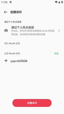 2、在音乐派对APP中点击“创建派对”,然后选择“通过个人热点连接”。