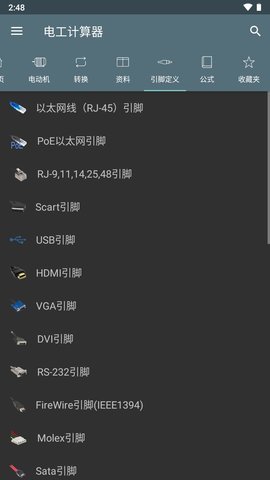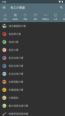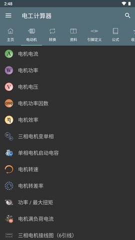 4、它拥有最全面的电气计算功能,主要分为电动机、转换、引脚定义、公式、资料等类型,分类非常详细,电气工可以根据自己的工作选择适合的计算功能。