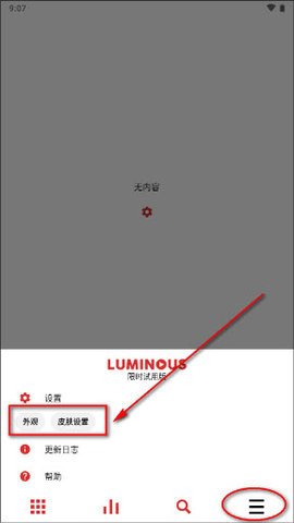3、当您打开Luminous时,会出现一个弹窗,在其中找到【皮肤设置】并点击。