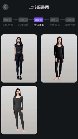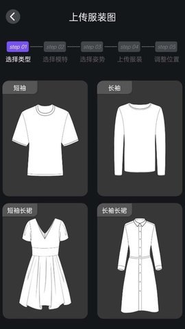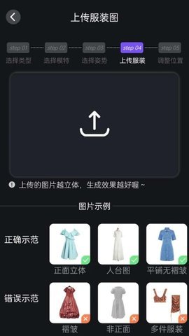 3、用户只需在编辑页面中按顺序选择类型、模特、姿势,然后上传所需试穿的服装照片。