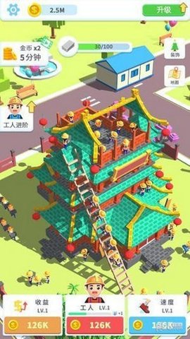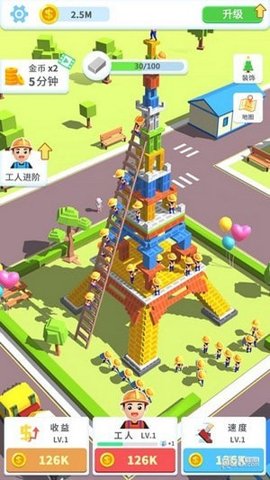 1、疯狂搬砖工人游戏中,玩家可以升级装备、解锁地标建筑等,拥有很多神奇的道具,可以建造世界各地知名的地标建筑。