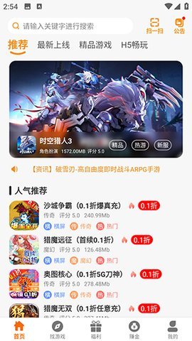 1、打开美奇玩APP后,用户会看到一个主界面,上面展示了各类游戏的推荐和排行。