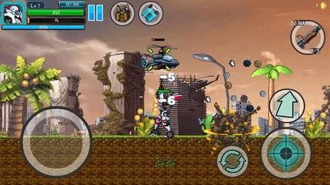 2、进入游戏后,左侧是虚拟摇杆,右侧有跳跃、射击、变身和弹夹容量按钮。