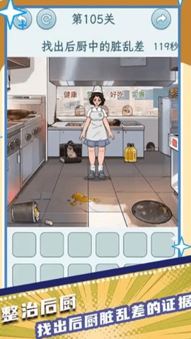 2、玩家需要点击菜里面的老鼠头,找出后厨中的脏乱差,首先点击冰箱上的脏盘子,点击左边的生锈铁锅,点击地上的污水,点击档口左边的青苔。