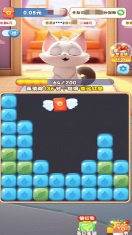1、玩家需要帮助猫猫消除方块以获得高分过关,同时还可以通过培养猫猫来升级,获取更多红包奖励。