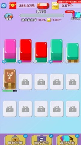 1、玩家需要按照经典的合成方法,将相同的动物卡片放置在一个槽内以实现消除,从而获得红包奖励。