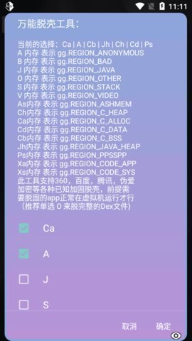 万能脱壳工具是一款非常实用的工具应用,它在处理内存时使用了一些特定的表示方法,比如Ps内存表示gg.REGION_PPSSPPCa内存表示gg.REGION_C_ALLOCO内存表示gg.REGION_OTHER。这款工具不仅支持36百度等常见应用商店,还为安卓手机用户们提供了更多便利,让他们能够更轻松地完成相关的脱壳功能。 在使用GameGuardian时,我们可能会发现应用列表中显示的是随机字符串。