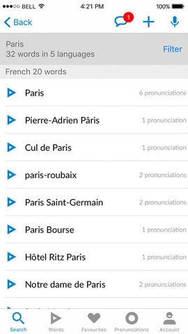 4、用户还可以跟踪最近听到的发音,比较同一种语言中同一个词的不同口音,以及注意最喜欢的用户的发音。