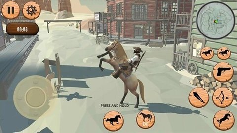 4、玩家可以进行奔跑、攻击、御马等操作,享受西部牛仔的生活。
