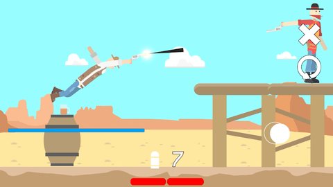 2、通过简单的操作控制布娃娃牛仔移动和射击,击败敌人,完成关卡任务。