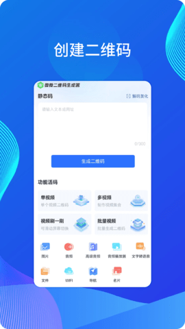 微微二维码是一款功能全面的其他应用,它支持活码二维码随时修改而不改变二维码本身,也支持导航生成二维码。与市面上的其他二维码扫描软件相比,微微二维码具有许多特点。除了支持wifi生成二维码、视频生成二维码、文本生成二维码、文件生成二维码外,它还支持名片生成二维码,为用户提供了更加便捷的使用体验。