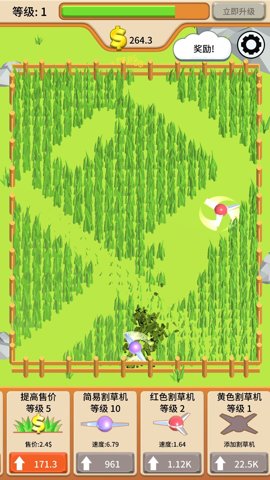 2、游戏开局一把镰刀疯狂割草草场,解锁升级你的工具装备,提升割草,更多的割草玩法解锁体验,打发休闲。