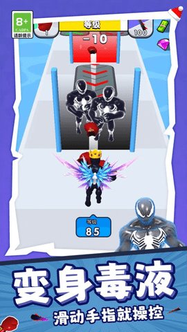 2、玩家需要操控毒液变性人进行冒险跑酷,通过不断吞噬敌人逐步变强征服一切敌人。