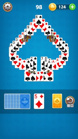 1、有28张扑克牌随机摆放成各种类似金字塔高低起伏的造型待回收,而玩家手中可利用的起手牌则有24张。