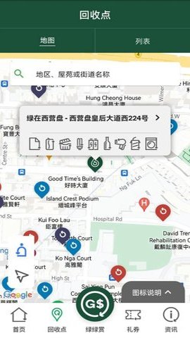 2、香港绿绿赏还提供回收点查询功能,让市民可以轻松找到各区的回收点位置及开放。