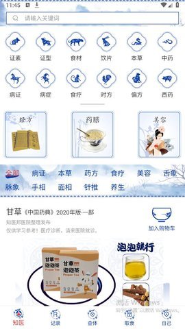 1、知医App还整理了各种食材、饮片、本草等知识,以及经方、药膳、美容等板块。