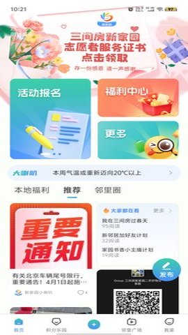 4、三间房新家园APP官方版是为朝阳区居民打造的生活服务软件,用户可以看到周边邻居,查看本地商户的优惠活动,便利享受家门的福利,打造充满特色的生活圈。