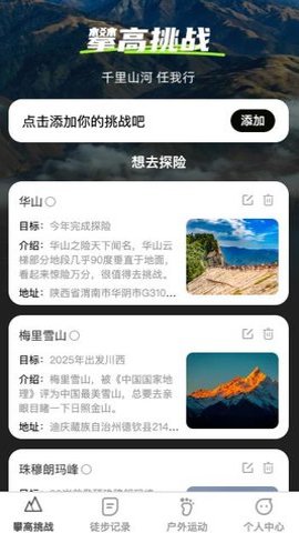 1、用户可以在软件中添加自己想要挑战的高山,发起挑战后记录攀登和过程。