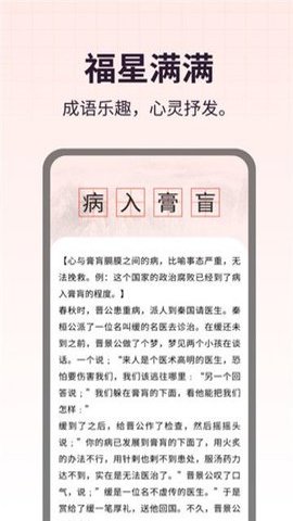 1、在福星满满App中,用户可以通过答题的方式来熟练掌握各种成语,通过闯关的方式逐步学习成语,挑战自己的成长。