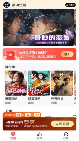 1、星河短剧APP是专为短剧爱好者打造的应用软件,集合了众多热门、经典的短剧作品,为用户提供了一个便捷、高效的观看平台。
