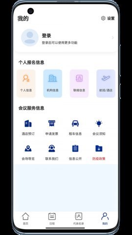 2、用户可以在应用中查看自己的参会记录、年会日程安排、个人信息维护以及年会人员名单通讯录等信息。