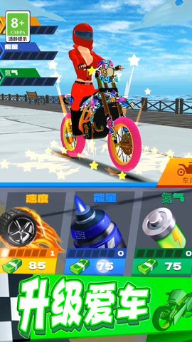 3、除了挑战性的关卡和丰富多样的比赛模式,疯狂特技摩托还拥有丰富的游戏内容和精美的游戏画面。