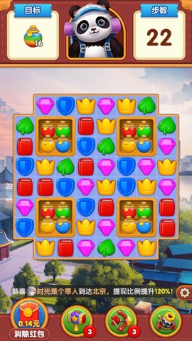 1、在熊猫爱旅行游戏中,玩家需要通过消除三个或更多相同的方块来完成关卡目标。