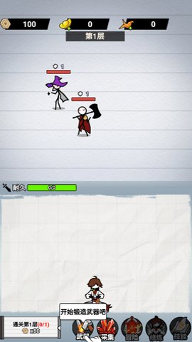 1、纸上当大侠是一款休闲放置点击游戏,玩家将从锻造一把简单的剑开始,不断杀怪赚取铜钱,然后采集矿石到锻造台,升级自己的神剑,解锁更强大的武器,拯救小美。