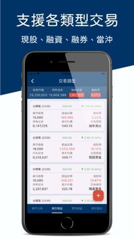 1、软件支持个股的现货、融资、融券和当冲分类,帮助用户清晰地了解每档股票在不同交易类别下的盈亏情况。
