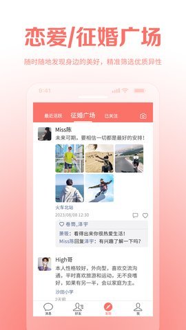 3、通过征婚广场、附近用户等功能,增加用户之间的互动和了解,提高相亲成功率。