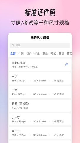 3、形白证件照内置了百余种官方指定的证照规格,涵盖了学生证照、职业资格证照、签证等各种类型,满足不同用户的需求。