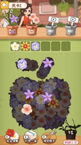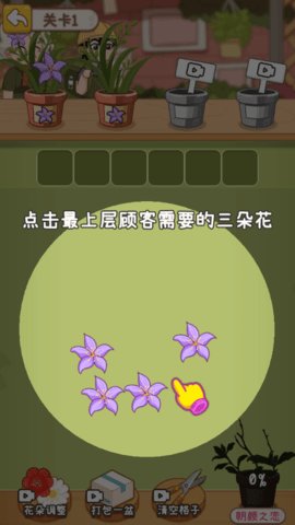 2、玩家需要观察上方花盆的花朵,点击顾客需要的花朵,只有最上层的花朵可以点击。