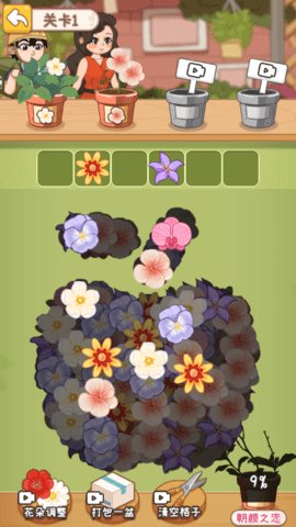 3、通过消除相同颜色的花朵来制作花束,达到进度100%即可通关。