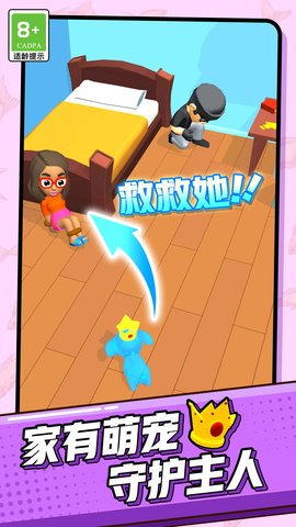 2、这款游戏的创意非常独特,玩家需要喂养萌宠,使用游戏场景内的物品来痛击匪徒,保护自己的小主人。
