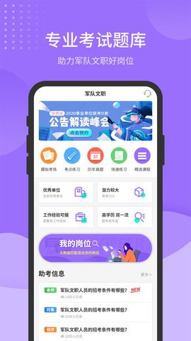 2、军队文职题库是一款专为军队文职考试设计的综合性学习软件,集试题练习、岗位信息查询、考试动态资讯于一体,为考生提供一站式的备考服务。