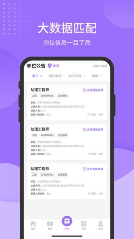 2、通过智能岗位匹配,根据考生的专业、经验等个人信息,精准推荐适合的文职岗位,帮助考生找到适合自己的职位。