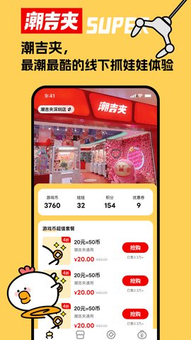 3、潮吉夹app是潮吉夹线下门店的官方客户端,用户可以通过该软件查看门店的最新信息和折扣活动,还能在线购买各种夹娃娃的游戏币。