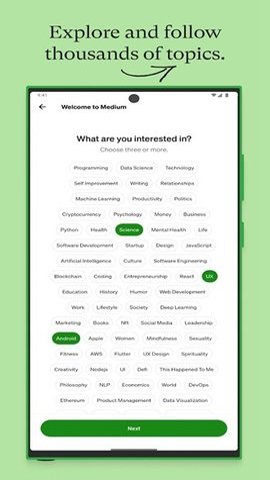 2、Medium手机版App提供了一个比传统博客或社交媒体更加注重内容质量和深度的环境。
