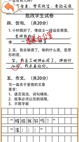 2、有很多小学生的语文试卷等待玩家去挑战。